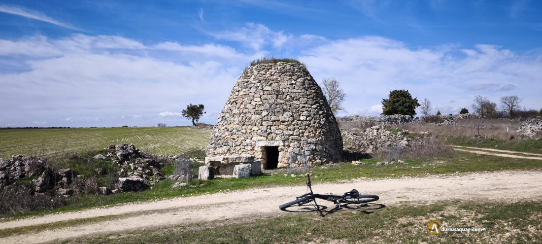 La ruta se ha tornado dura al final. Por el valle del arroyo de los Caños, el viento se envalentona y el Sol tiende a esconderse. Viento y frío importunan los últimos kilómetros, hasta que las bodegas de Baltanás nos reciben acogedoras.