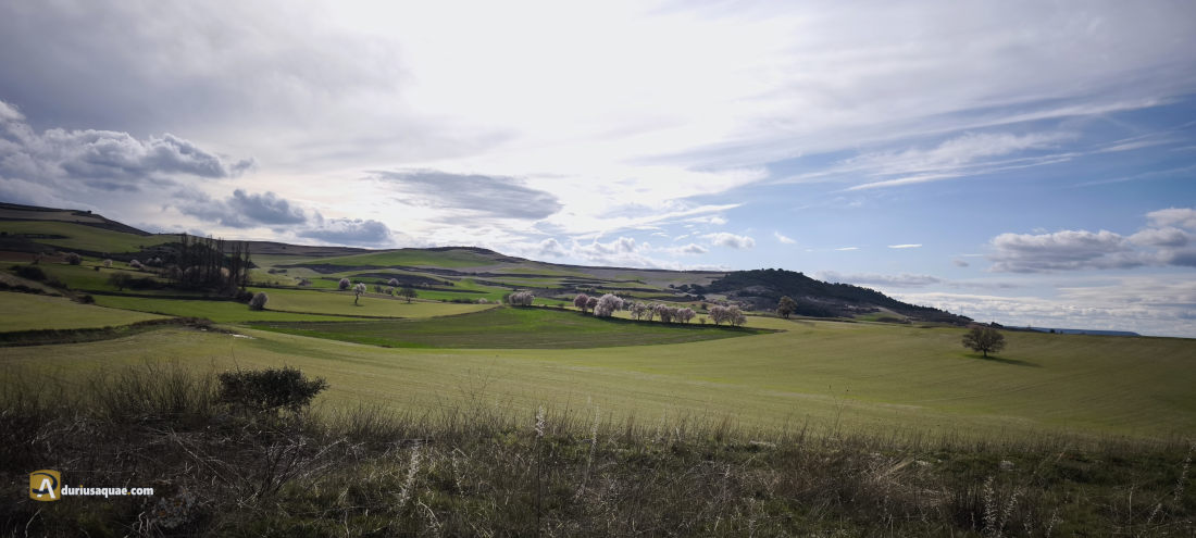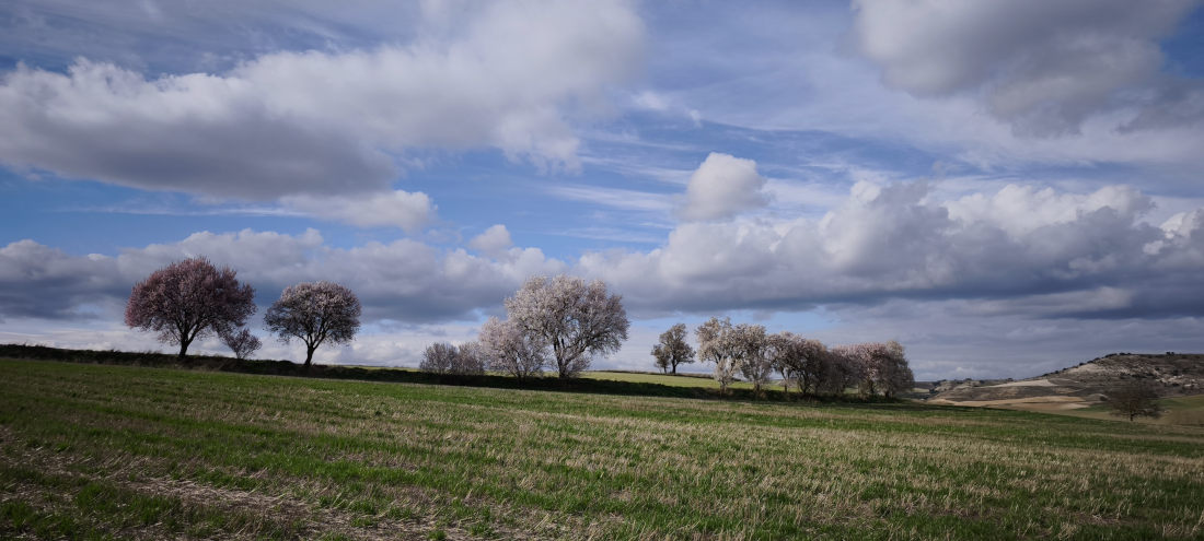 Los campos se van tornando verdes. Se pierden los ocres bajo los cereales incipientes hasta que llegamos a los montes. Allí los quejigos se toman su tiempo y sus hojitas esperan a los calores; y —como no—: los almendros. Para ellos no hay frio que valga, son valientes y, sin temor a las heladas, que tendrán que llegar, presumen con sus blusas blancas.